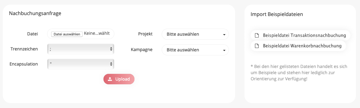 Wenn die Datei entsprechend vorbereitet wurde, kann die Datei ausgewählt und über den Button “Upload” hochgeladen werden. Anschließend werden die Transaktionen/Warenkörbe noch einmal zur Kontrolle angezeigt. Über den Button “Speichern” wird die Transaktion final hochgeladen.