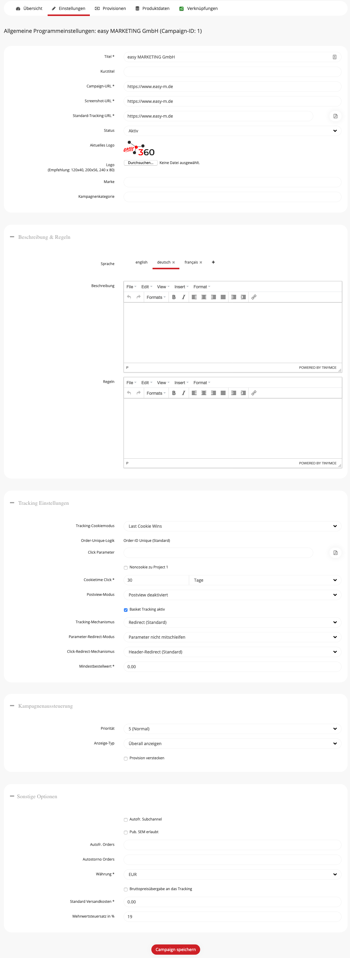 - Einstellungen: In den Kampagnen-Einstellungen können die generellen Einstellungen für die Kampagne vorgenommen werden.