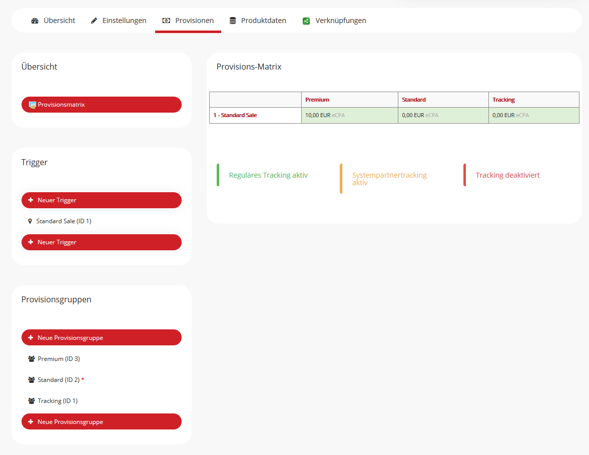 - Provisionen: Unter diesem Punkt können die Trigger und Provisionsgruppen für die Provisionierung eingestellt werden.