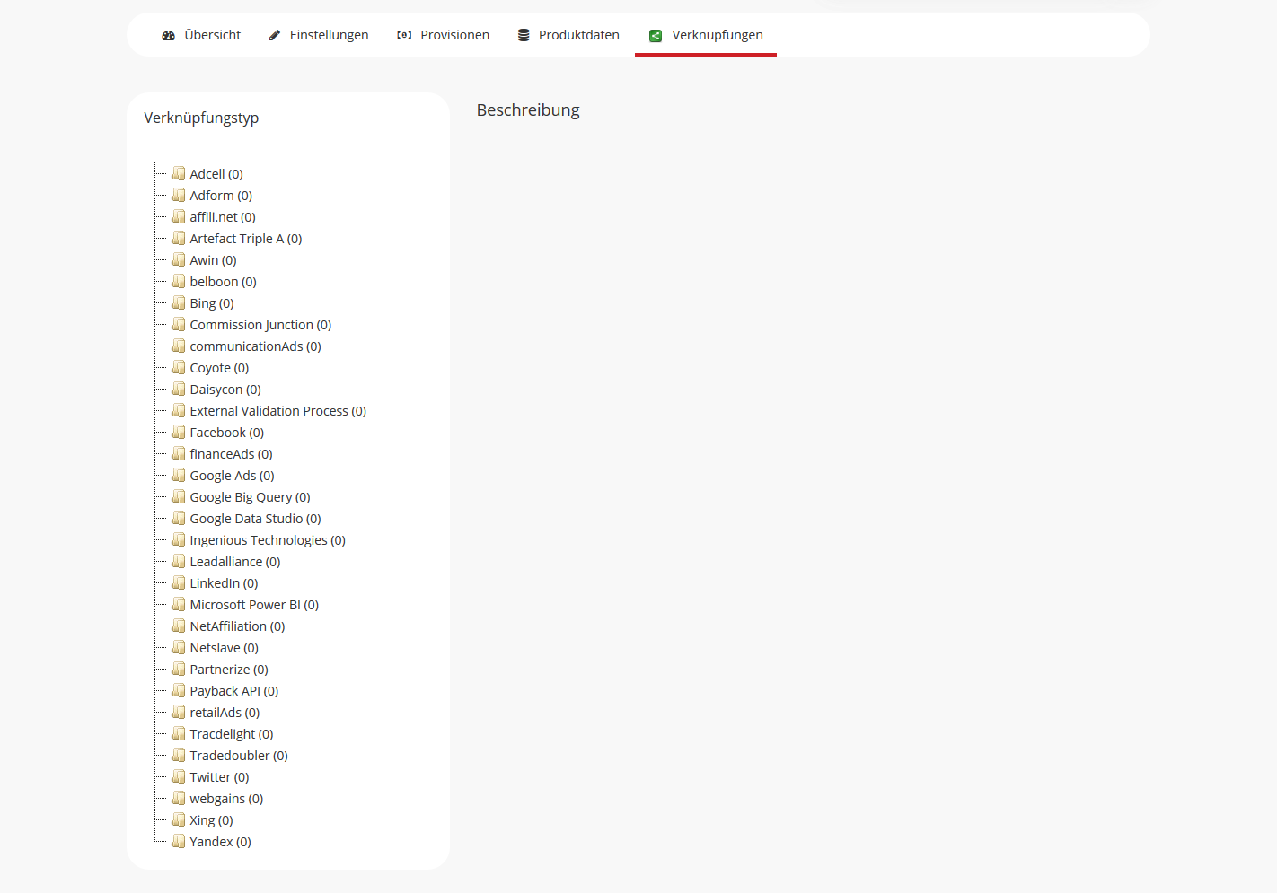 - Verknüpfungen: Unter diesem Punkt werden die entsprechenden Verknüpfungen zu externen Datenquellen eingepflegt. Dies dient dazu, um externe Daten in den entsprechenden Advertiser zu importieren.