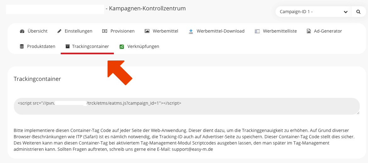 - Alternativ kann der Code auch für das entsprechende Partnerprogramm aus dem Frontend kopiert werden. Hierfür im Kampagnen-Kontrollzentrum den Reiter „Trackingcontainer“ anwählen. Der passende Tag-Manager ScriptCode wird nun angezeigt.