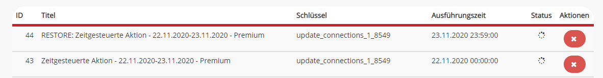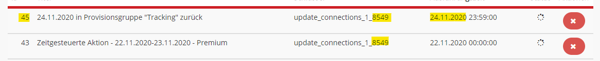 Für unser Beispiel heißt das, dass die Aktion mit der ID 44 gelöscht wird, indem rechts auf das Kreuz geklickt wird. Die Aktion mit der ID 43 wird noch weiterhin ausgeführt. Das Projekt bleibt demnach in der Provisionsgruppe “Premium” und wird nach diesem Stand nicht mehr zurück verschoben. Dies kann dann mit einer erneuten zeitgesteuerte Aktion geändert werden.