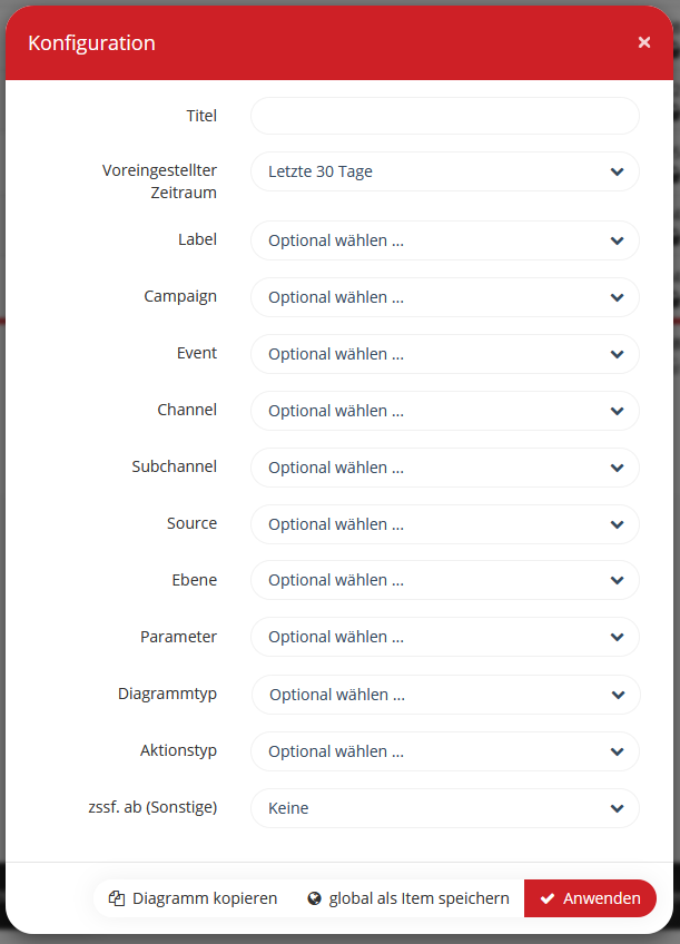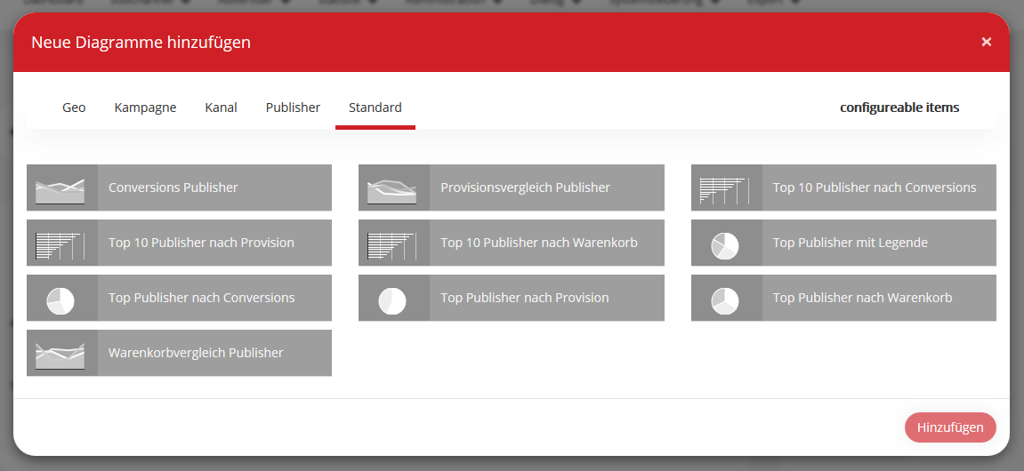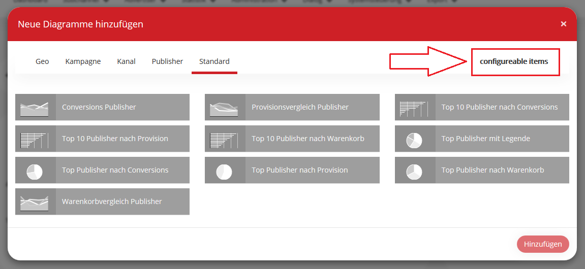 Wenn keines davon für den vorgesehenen Zweck passend ist, können über den Reiter “configureable items” eigene Diagrammtypen definiert werden.