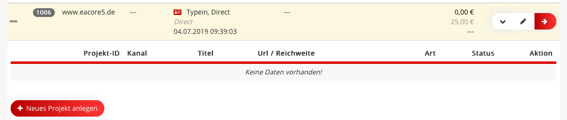 Um ein neues Projekt anzulegen muss über den Reiter “Publisher” die “Publisherliste” geöffnet werden. Nun wird der entsprechende Publisher herausgesucht, für den ein neues Projekt erstellt werden soll und öffnen die Projektansicht über das “+” Symbol auf der linken Seite.