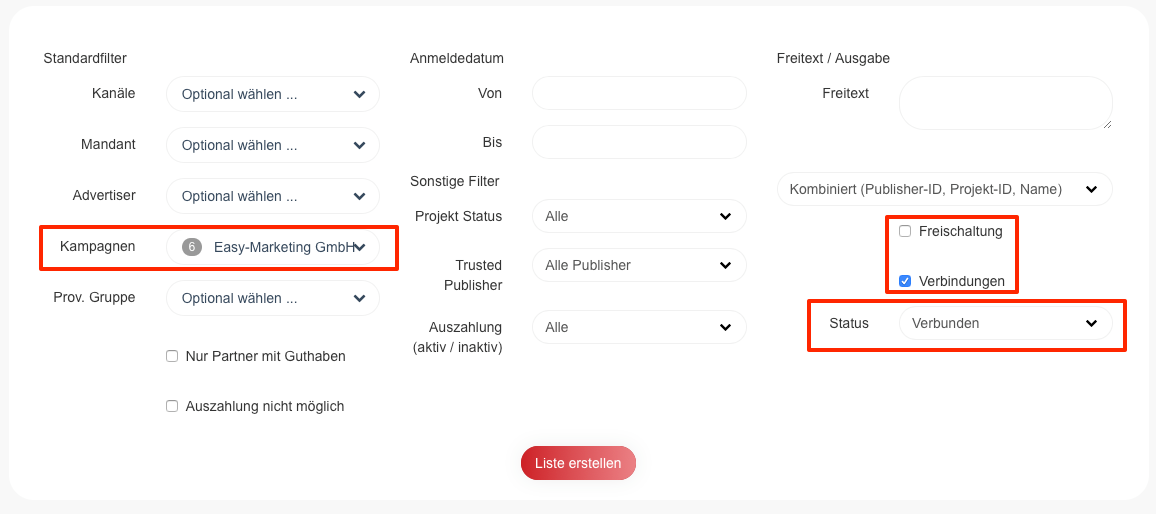 Nun muss die entsprechende Kampagne, sowie der Status ausgewählt werden.
