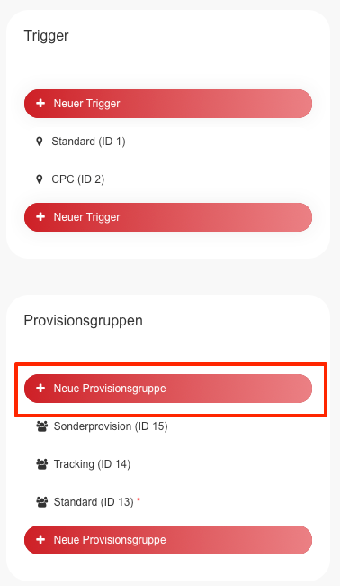 Am linken Rand werden alle Trigger und bereits erstellten Provisionsgruppen angezeigt.