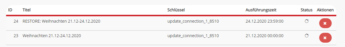 - Ist eine Aktion noch nicht aktiv, kann sie über das Kreuz-Symbol rechts gelöscht werden.