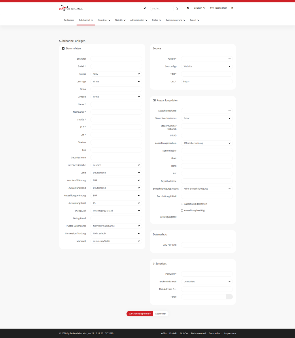 Auszahlungsdaten: Hier werden die auszahlungsrelevanten Daten für den Partner hinterlegt. Dazu gehören u. a. die Kontodaten sowie die Steuernummer.