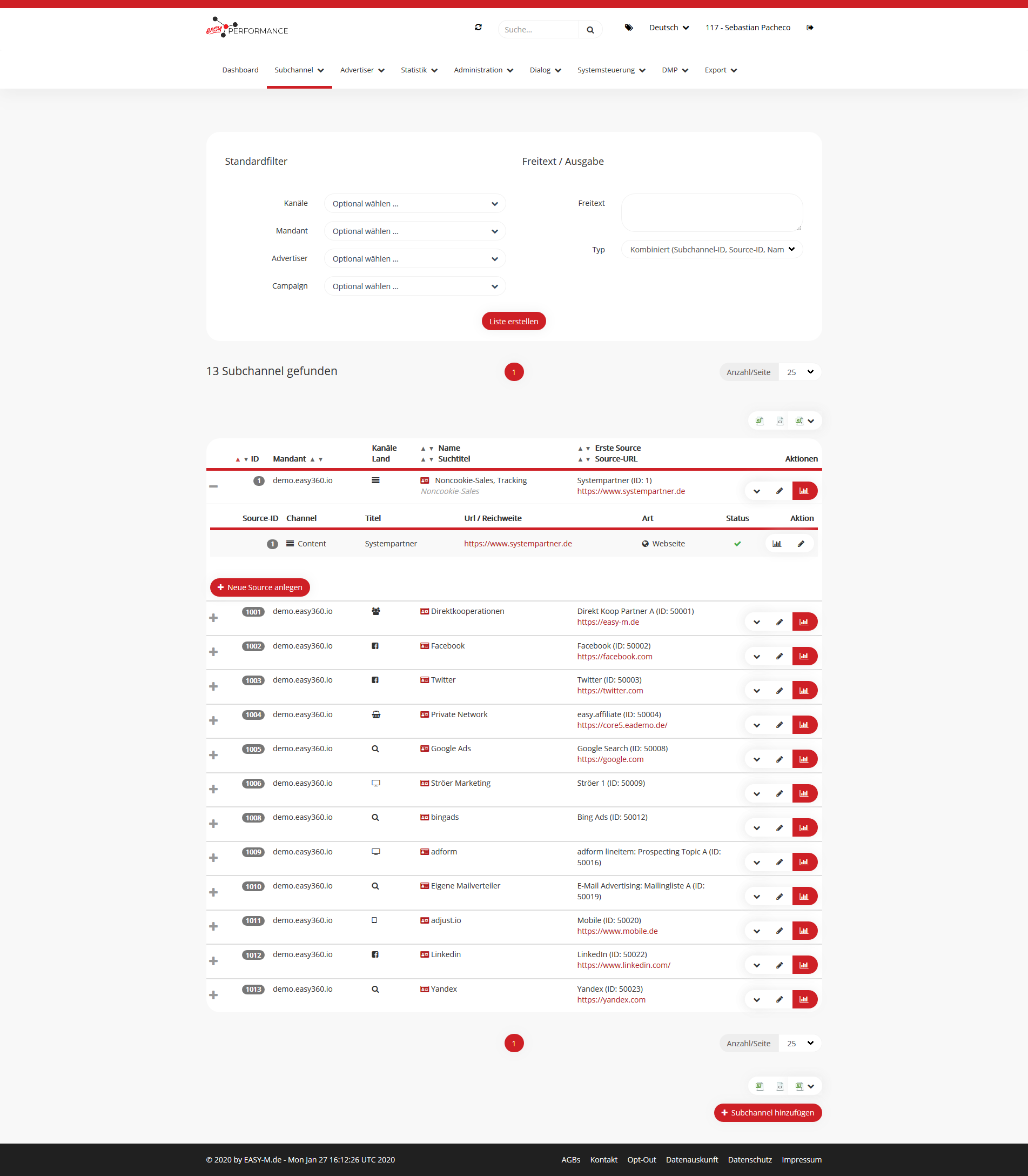 In der Subchannelliste werden alle Subchannel des Systems aufgelistet. Über die Buttons auf der rechten Seite können Statistiken und Transaktionen der Subchannel aufgerufen werden. Zudem kann dort ein Subchannel nachträglich bearbeitet werden.