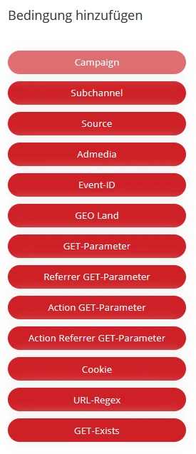 Im linken Bereich werden die Bedingungen festgelegt, wann der Tag ausgespielt werden soll. Dies kann bei einem bestimmten Subchannel sein oder nur unter gewissen URLs.
