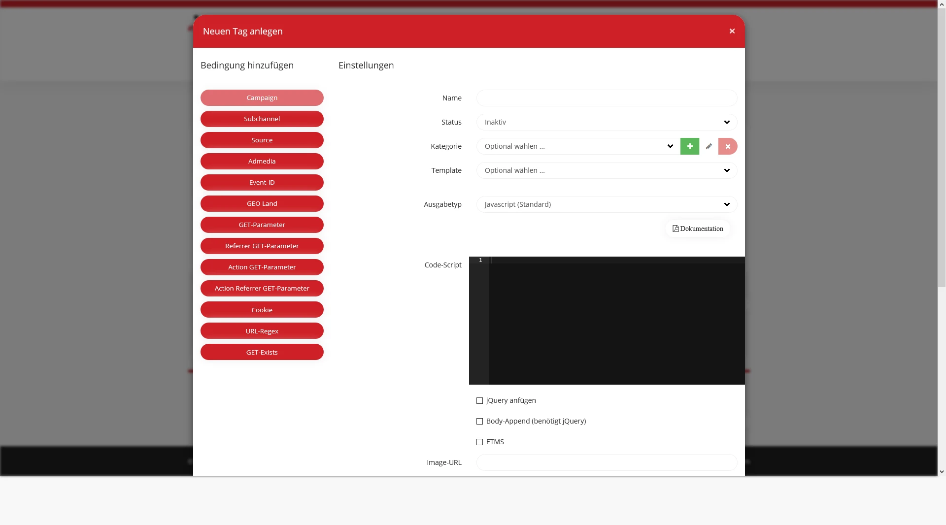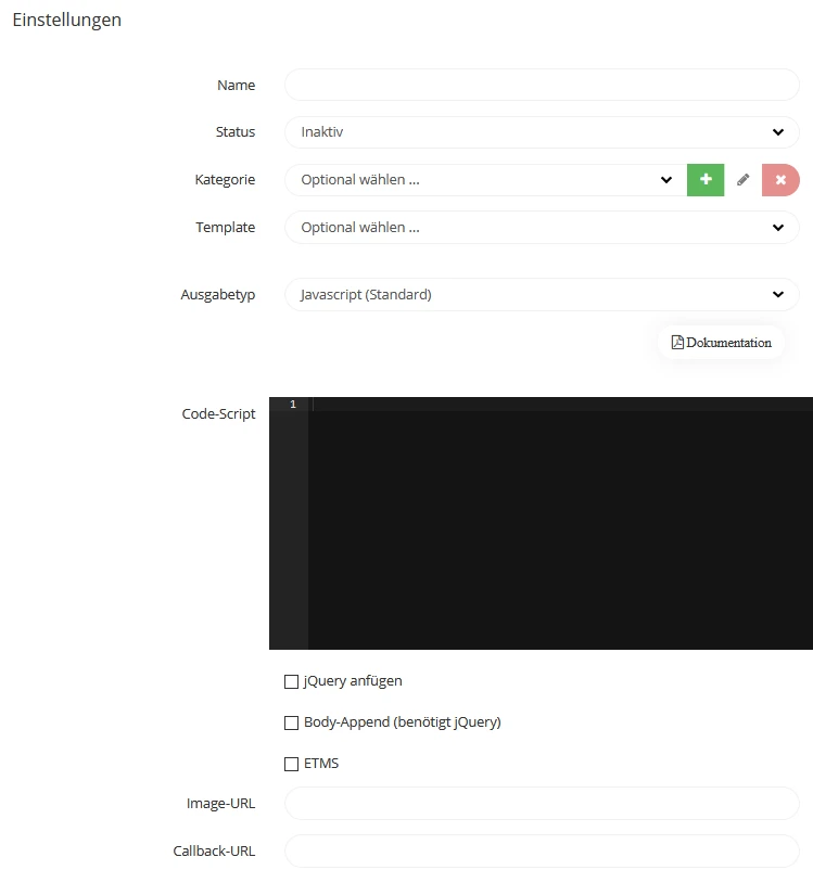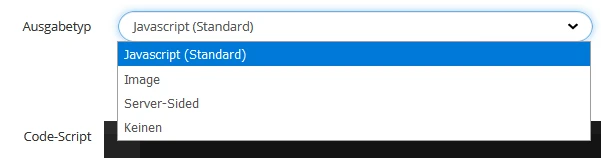Javascript (Standard): Wenn beim Ausgabetyp “Javascript (Standard)” ausgewählt wurde, kann unter “Code-Script” ein Javascript-Code hinterlegt werden, welcher dann ausgespielt wird.