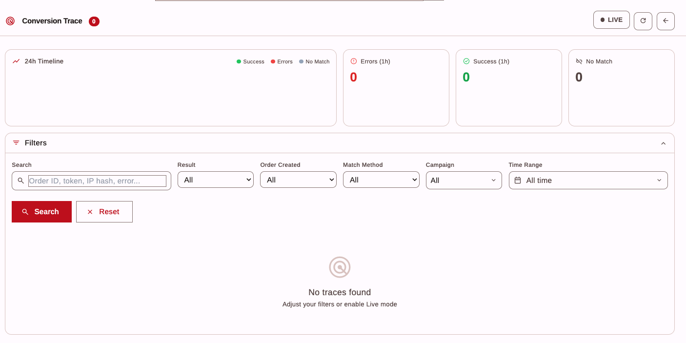 Das Conversion Trace Tool ermöglicht die Echtzeit-Überwachung und Analyse aller eingehenden Tracking-Requests (etrack/ebasket). Jeder Conversion-Versuch wird mit allen Details protokolliert – ob erfolgreich oder nicht.