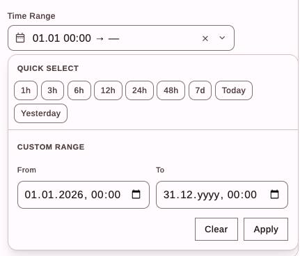 | Time Range | DateTime Range Picker | Zeitraum-Filter mit Quick-Select Presets und Custom Range (siehe unten). |