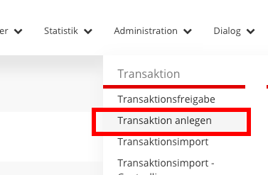 Um eine Transaktion anzulegen, muss über den Reiter „Administration“ der Punkt „Transaktion anlegen“ ausgewählt werden.