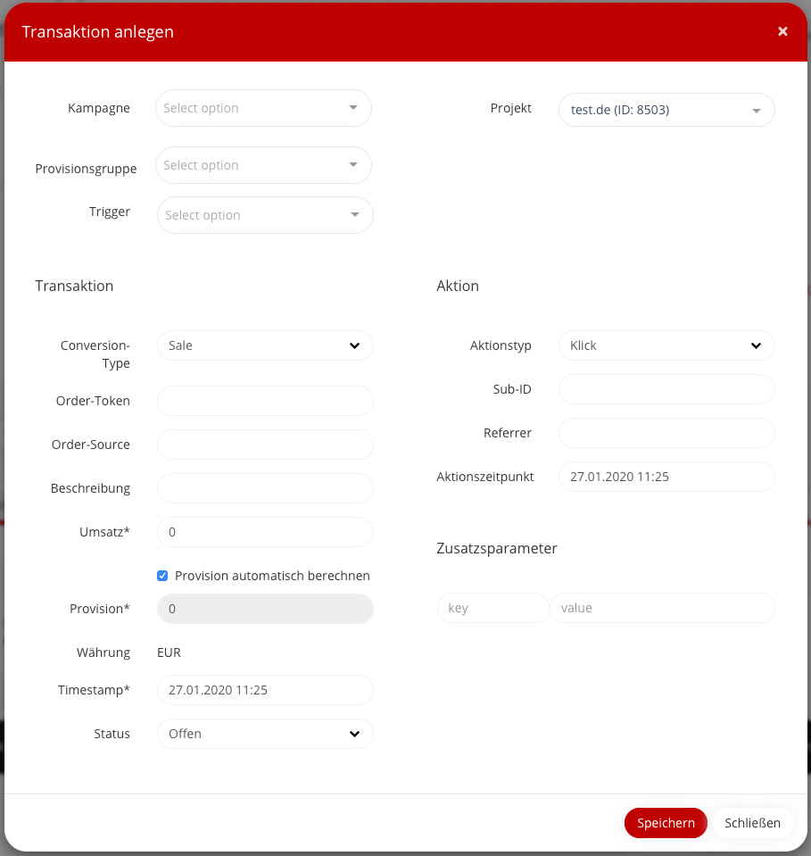 Art der Transaktion auswählen → Lead / Sale / Klick (Pflichtfeld).