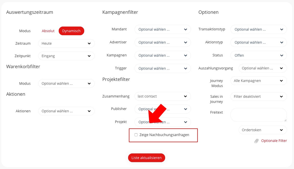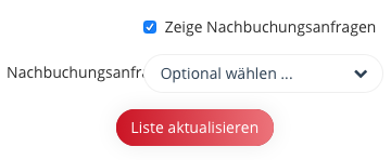 In den Transaktionsfiltern ist die Checkbox “Zeige Nachbuchungsanfragen” verfügbar. Wird dieser angehakt und anschließend auf den Button “Liste aktualisieren” geklickt, werden alle Nachbuchungsanfragen angezeigt.
