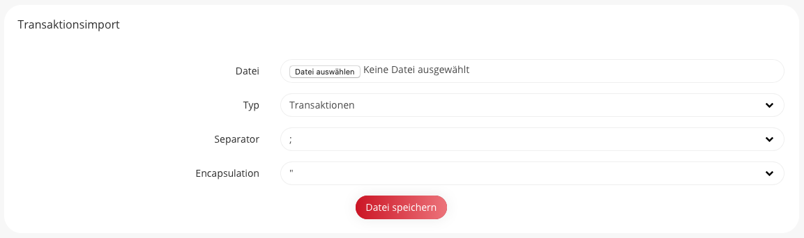Es öffnet sich nun ein weiteres Fenster, in dem die Datei ausgewählt werden muss. Unter Typ bleibt “Transaktionen” ausgewählt. Die Werte unter “Separater” und “Encapsulation” bleiben ebenfalls unverändert, sollten keine Anpassungen an der .csv Datei hierzu vorgenommen worden sein.