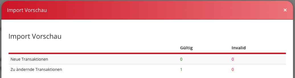 Abschließend gibt es noch eine Kontrolle, ob die Transaktion auch angepasst werden. Hierbei muss unter “Gültig” die Anzahl der zu ändernden Transaktionen angezeigt werden.