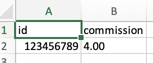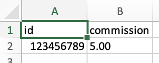 Die für die Anpassung der Provision benötigten Spalten sind folgende: “ID” und “Commission”. Diese zwei Spalten sind Pflichtfelder und werden für den Upload zwingend benötigt.