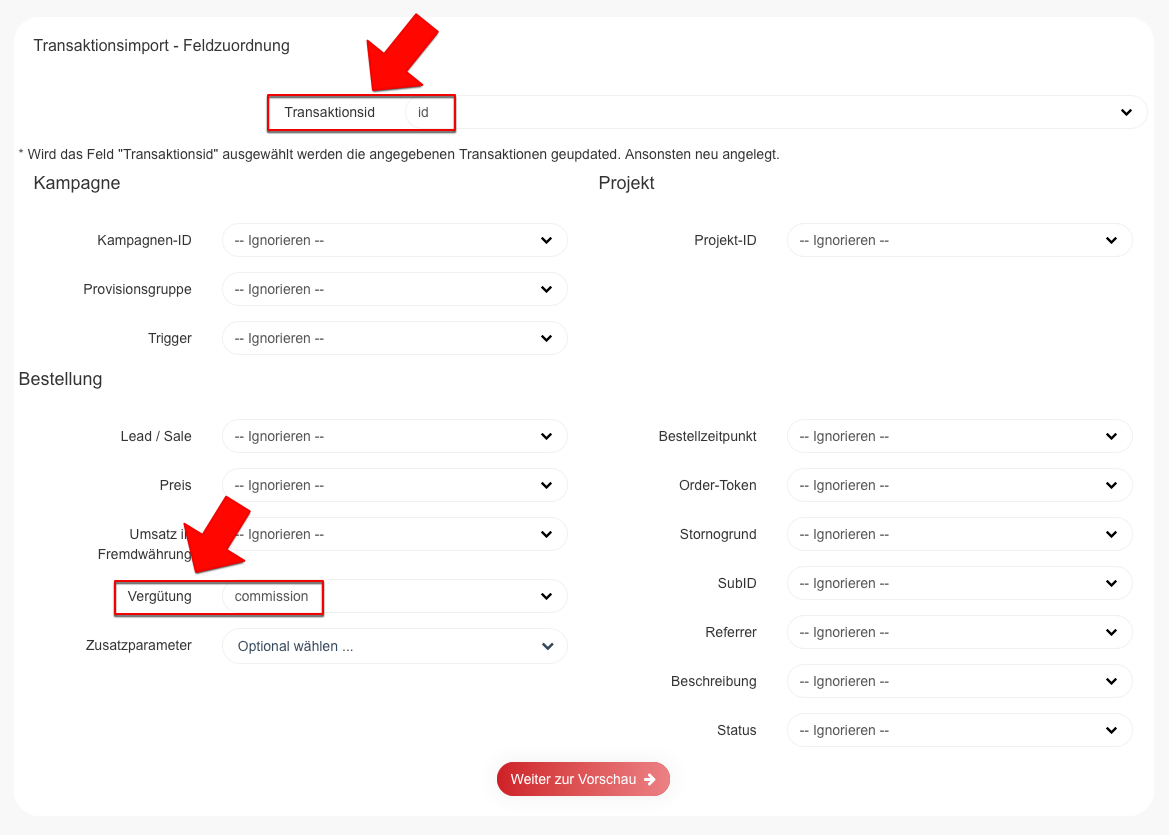 Anschließend öffnet sich das Fenster für die Zuordnung der Felder. Normalerweise werden die Felder durch den Importer automatisch erkannt. Sollte dies nicht der Fall sein, können diese aber auch händisch zugeordnet werden. Die wichtigen Felder sind hierbei “Transaktionsid” und “Vergütung”. Hier werden die entsprechenden Felder den Spalten der .csv Datei zugeordnet.
