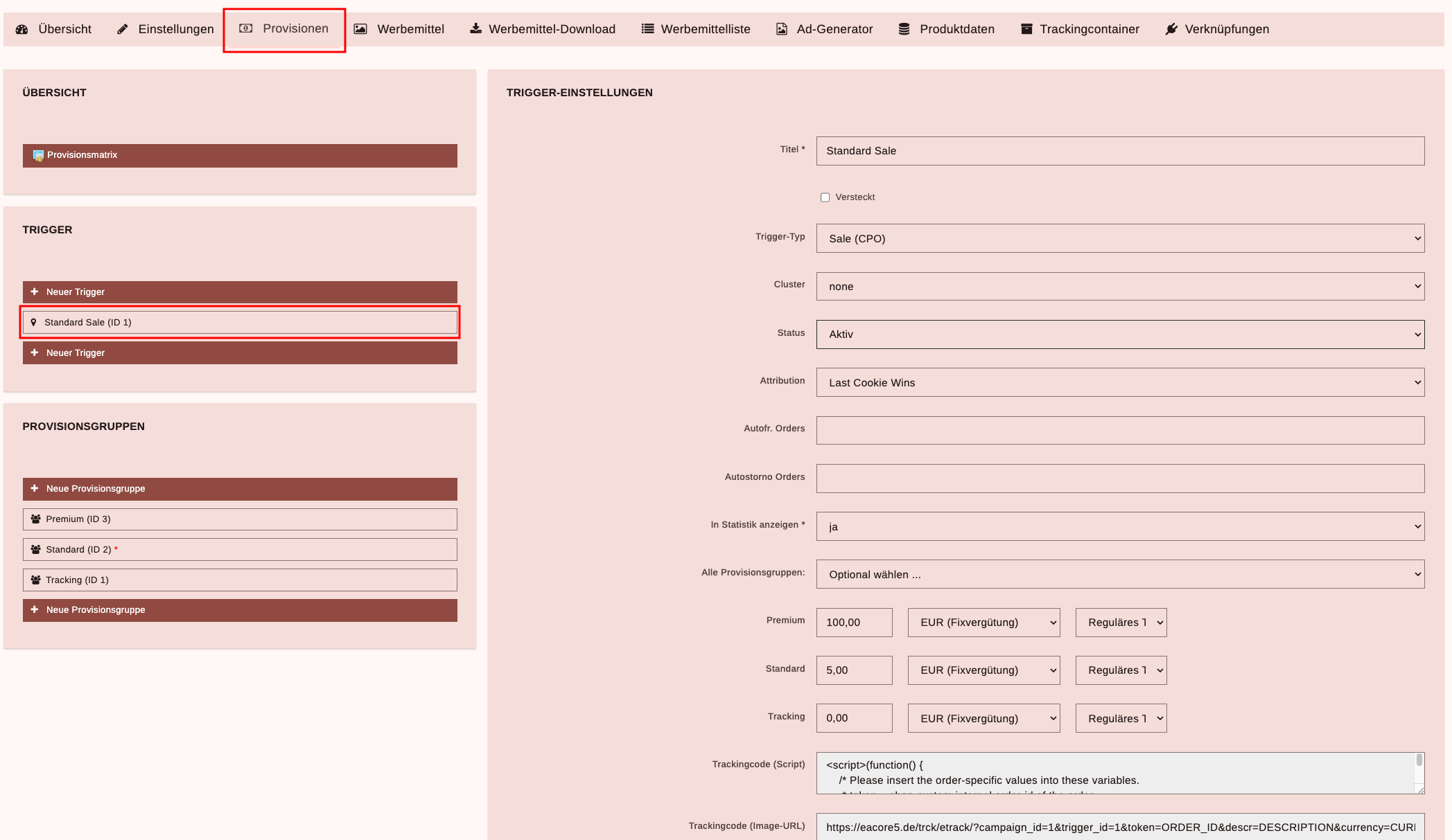 Neue Trigger werden unter dem Menüpunkt „Provision“ angelegt und gepflegt.