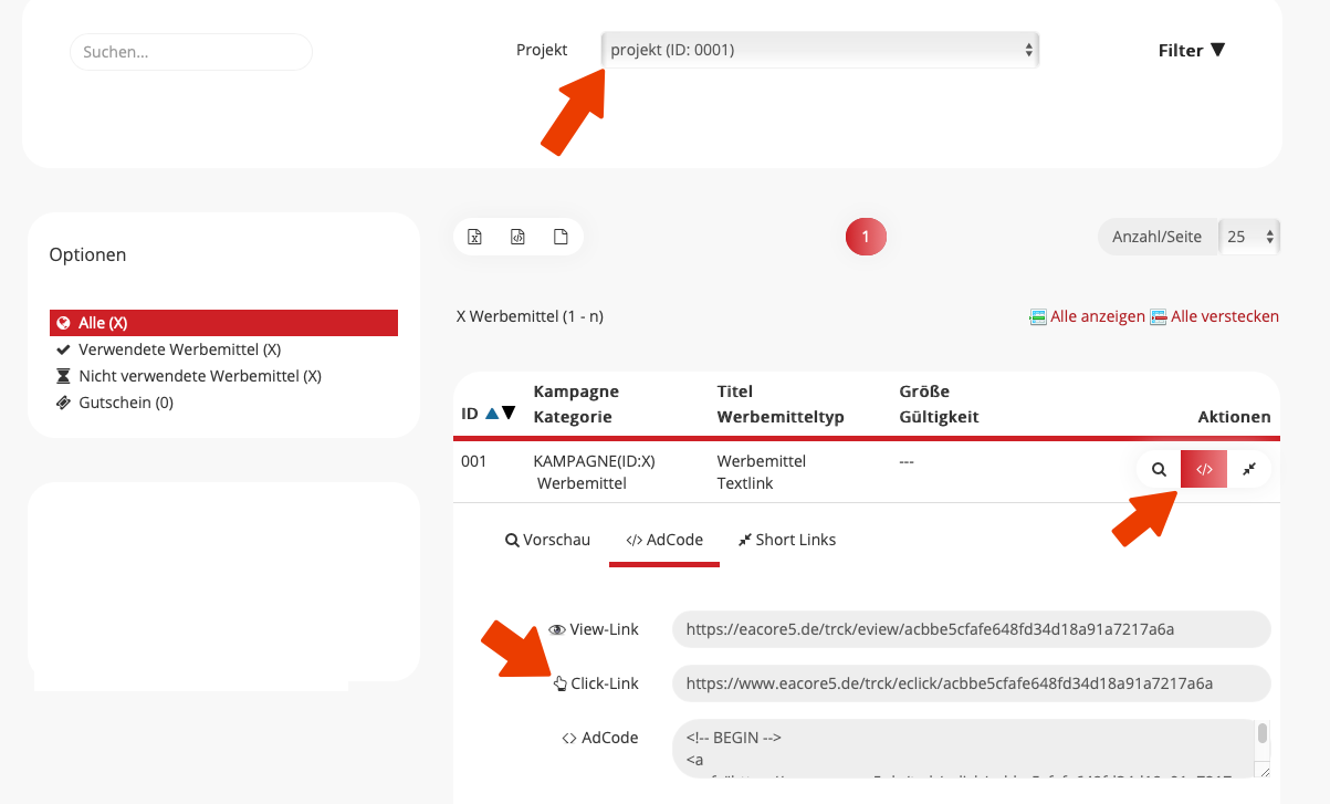 Im sich nun öffnenden Fenster muss das entsprechende Projekt ausgewählt werden, für welches man den Klicklink benötigt. Anschließend wird das Werbemittel ausgewählt und über das Symbol “</>” der Klicklink angezeigt.