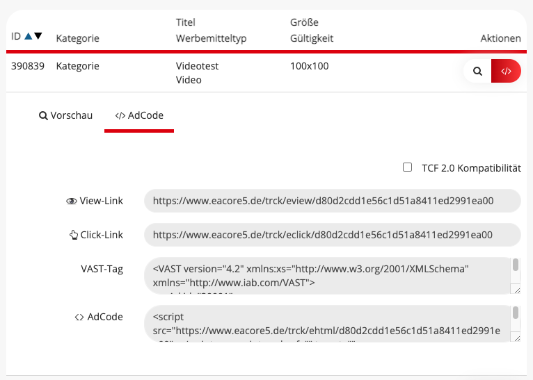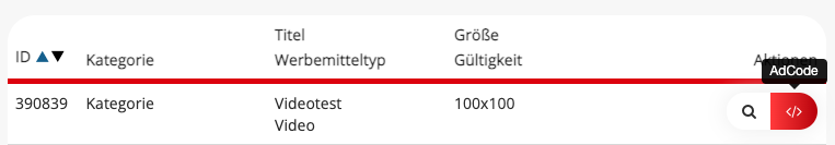 Nun werden alle Werbemittel in einer Tabelle angezeigt, welche sich in der entsprechenden Kategorie befinden. Über den Button “AdCode” …