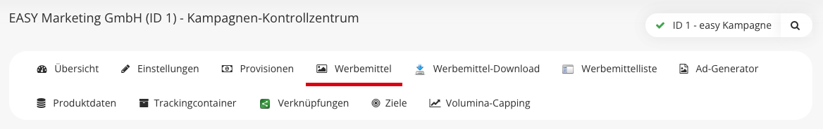 Hierzu muss über den Reiter “Kampagne” in das “Kampagnenkontrollzentrum” gewechselt werden. Über den Reiter “Kampagne” → “Werbemittel” kann die Werbemittelverwaltung auch umgehend erreicht werden: